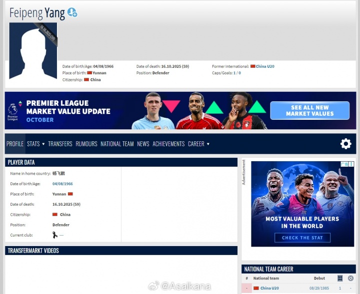 杨力维、杨舒予的父亲,前男足国青队球员杨飞鹏物化,享年59岁