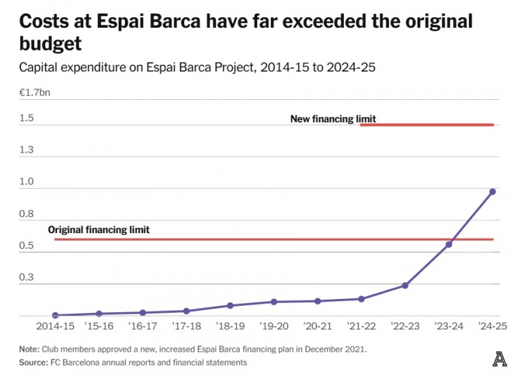 一起工程原定于2017年5月至2021年3月四年内完成。名堂预算6亿欧元,由三部分均派:新诺坎普2亿欧元定名权收入、2亿欧元正向运营现款流及2亿欧元银行贷款。可是,近十二年后,名堂仍在进行,成本早已失控。