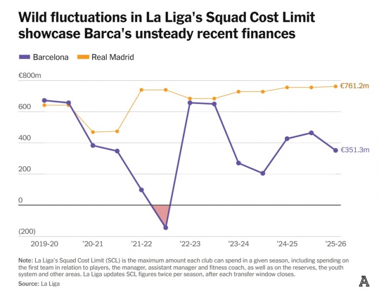 西甲球队成本上限的剧烈波动突显了巴萨近期财务景色不褂讪