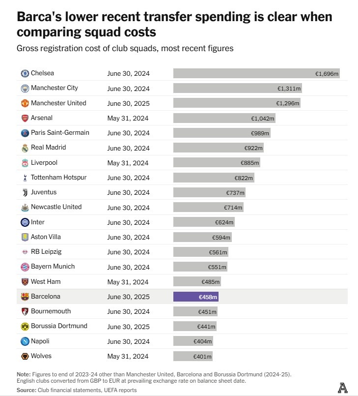 当比拟球队成本时,巴萨近期较低的转会支拨无庸赘述