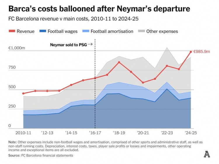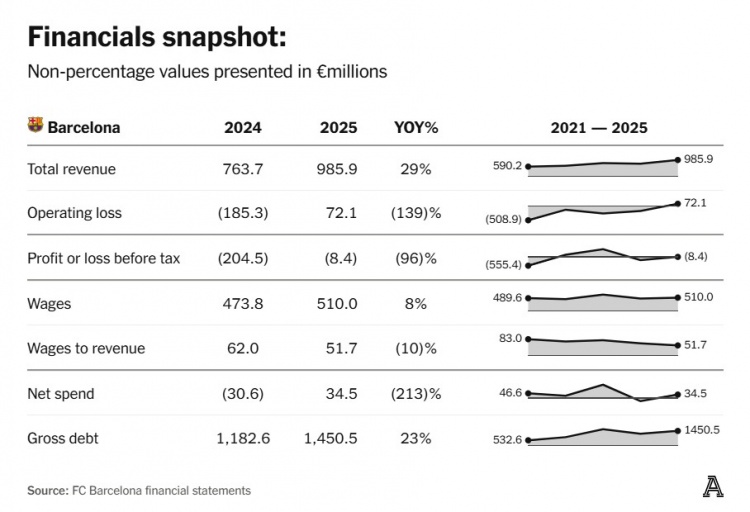 留下低成本球员戒指转会支拨,但另一面是这些球员深知自身价值并索求相应待遇。巴萨足球工资账单再度攀升,上赛季增长2630万欧元(7%)。亚马尔新合同(年值可达4000万欧元)仅终末一个月计入上赛季数据,故本年度工资再涨绝不料外。