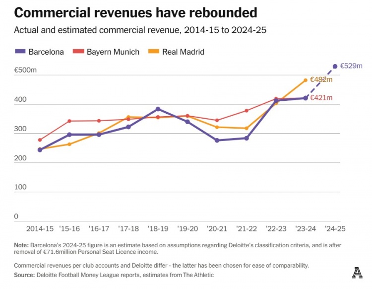 转播收入的变化一目了然。上赛季因闯入欧冠四强,该收入增长3%。但24/25赛季的转播权收入仅归附至21/22年水平——那是巴萨享有全额西甲分红的终末一年。