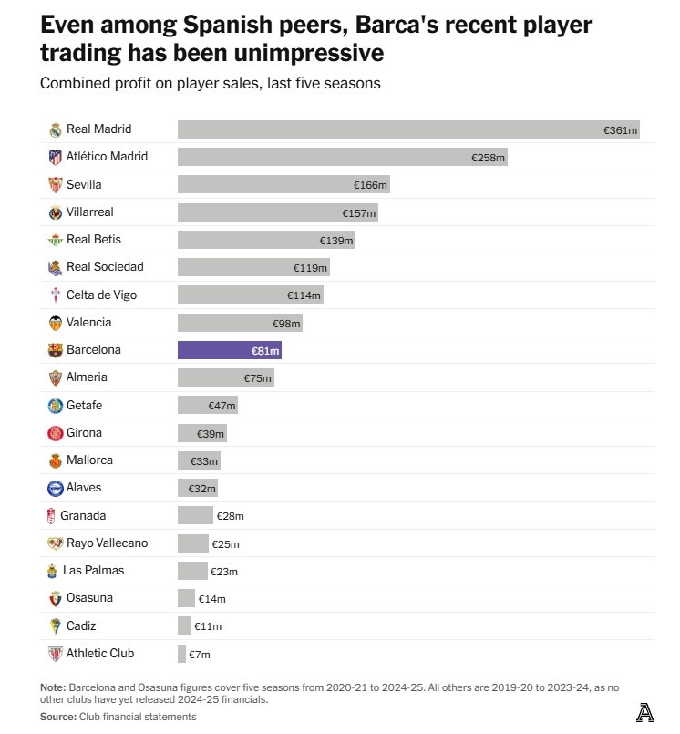 尔后卖东说念主收益缩水,即便23/24赛季通过出售登贝莱、凯西和尼科-冈萨雷斯赢利8060万欧元。当年五赛季球员销售总利润仅8140万欧元,若非21/22赛季对球员价值计提1.6亿欧元减值,数字将更出丑。此利润水平在西甲中游,远逾期于两家马德里俱乐部及欧洲多家敌手。