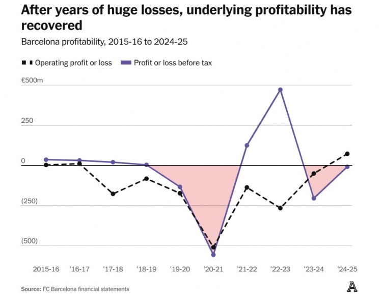 巴萨在多年巨大损失之后,基础盈利能力已归附