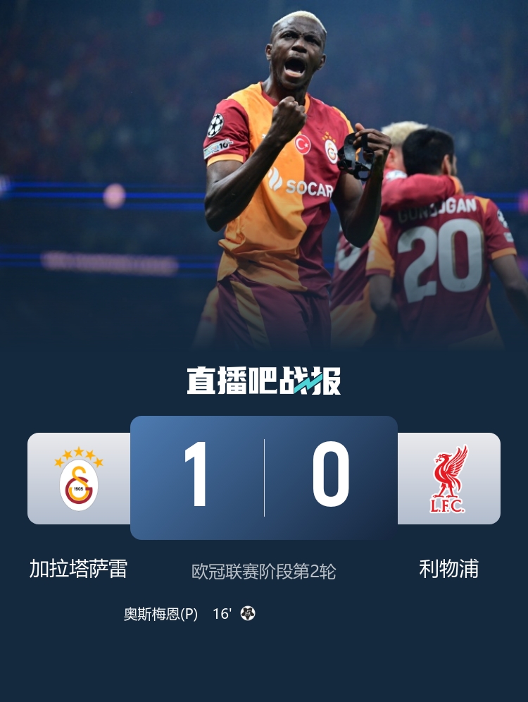 利物浦爆冷0-1不敌加拉塔萨雷,切尔西1-0投诚本菲卡,热刺2-2平博德能干。