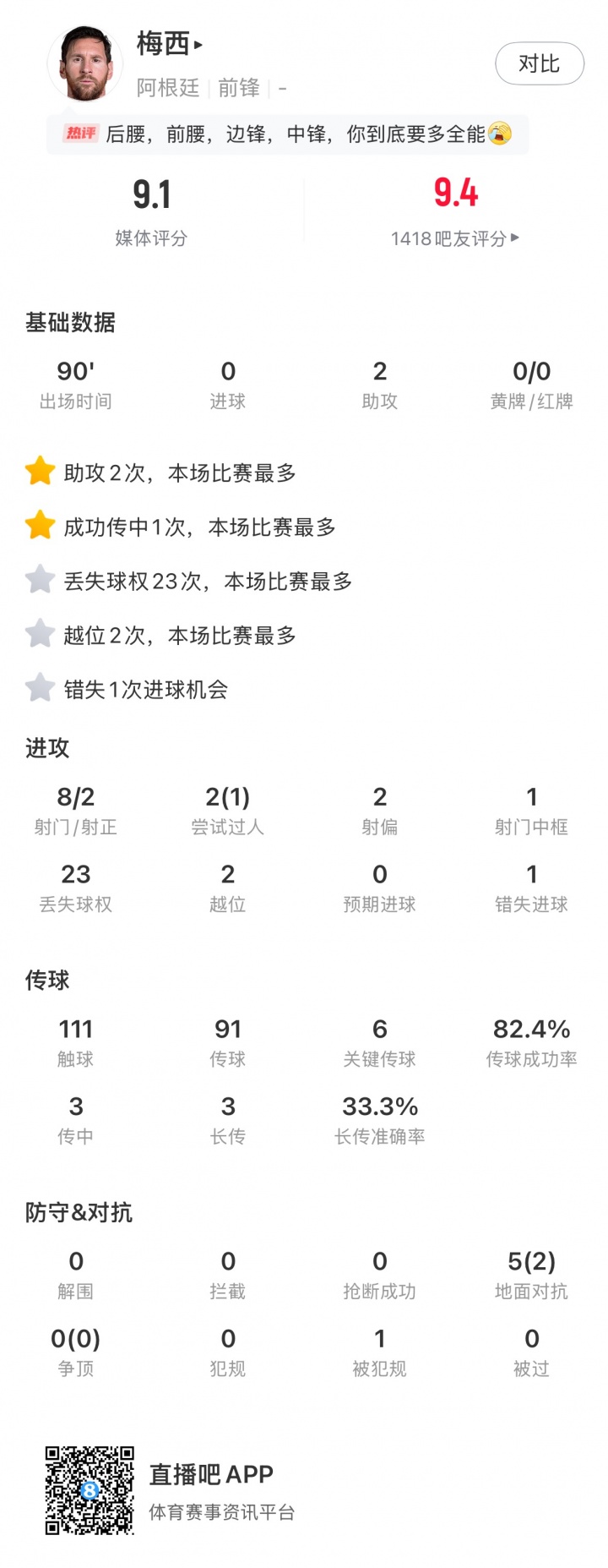 全场111次触球,91次传球,6次要道传球,5次造反2次得胜。