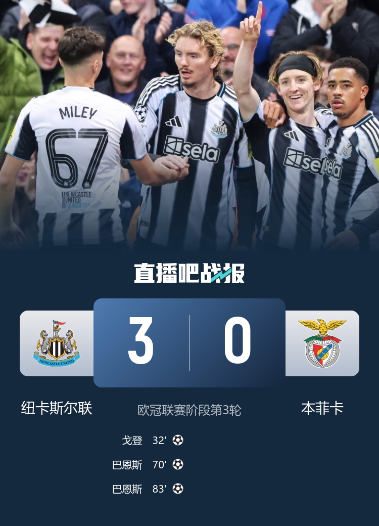 10月22日讯 欧冠联赛阶段第3轮首个比赛日戒指,3场英超球队(阿森纳、曼城、纽卡)的欧冠比赛齐收效拿下收效且收效零封敌手。