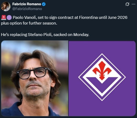 罗马诺示意:“瓦诺利行将与佛罗伦萨签约,契约时限至2026年,含延迟一年的条件。他将取代周一被衔命的皮奥利,成为紫百合新帅。”