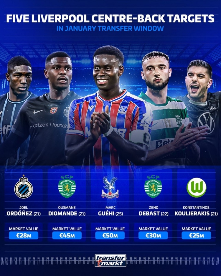 11月25日讯 利物浦在本赛季证据高开低走,展望将在冬窗补强中卫位置,《转会市集》也列出了他们的五大潜在缠绵及德回身价: