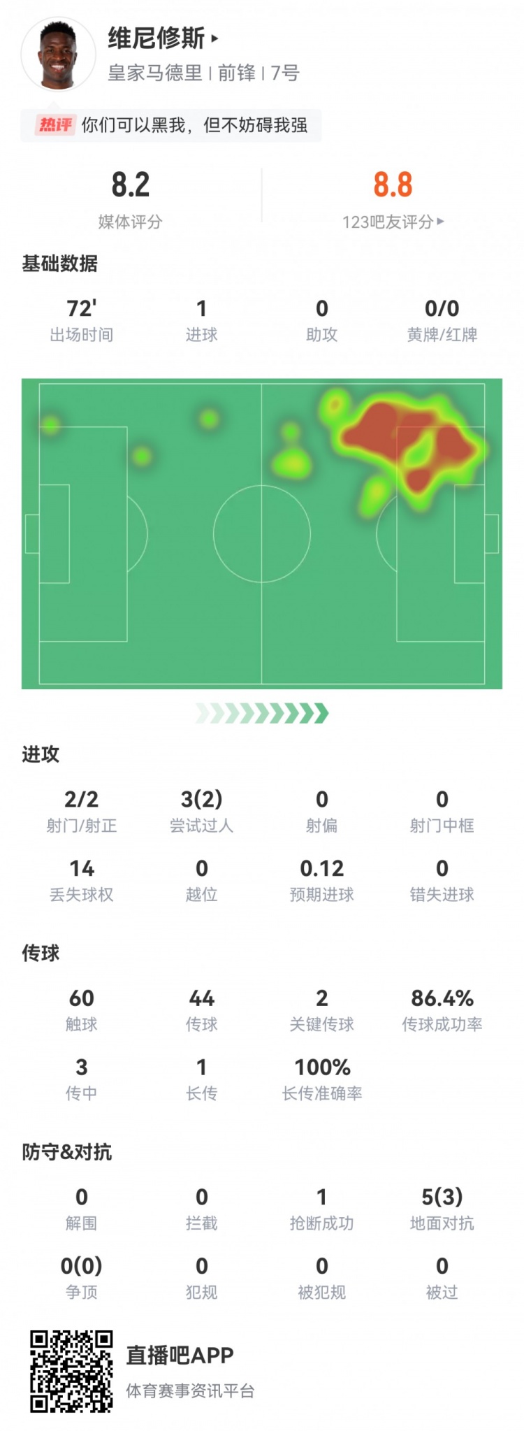 8月31日讯 西甲第三轮,皇马暂2-1跳跃马洛卡。此役维尼修斯首发72分钟被换下,球员全场要点数据如下↓