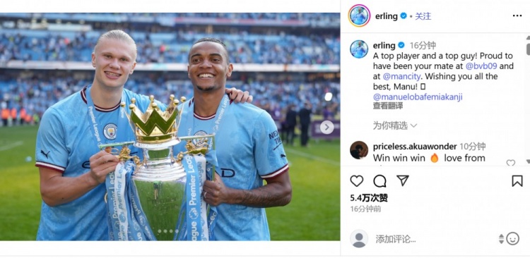 哈兰德写说念:“一位顶级球员,亦然顶级的好昆仲!很炫耀曾在多特蒙德和曼城与你并肩战争。祝你一切顺利,Manu!”