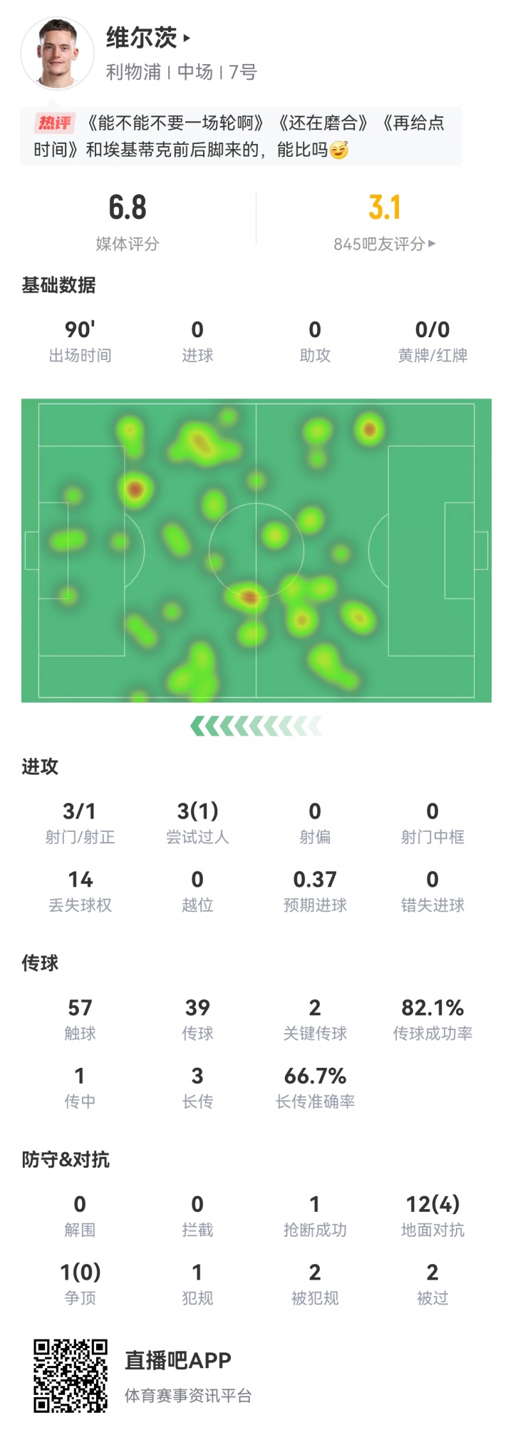 维尔茨未能展现出任何机敏度。这位德国国脚14次丢失球权,13次抵挡仅赢下4次(收效用31%)。下半场一次传球纰缪后,他双手掩面——信心昭着已遭遇重挫。