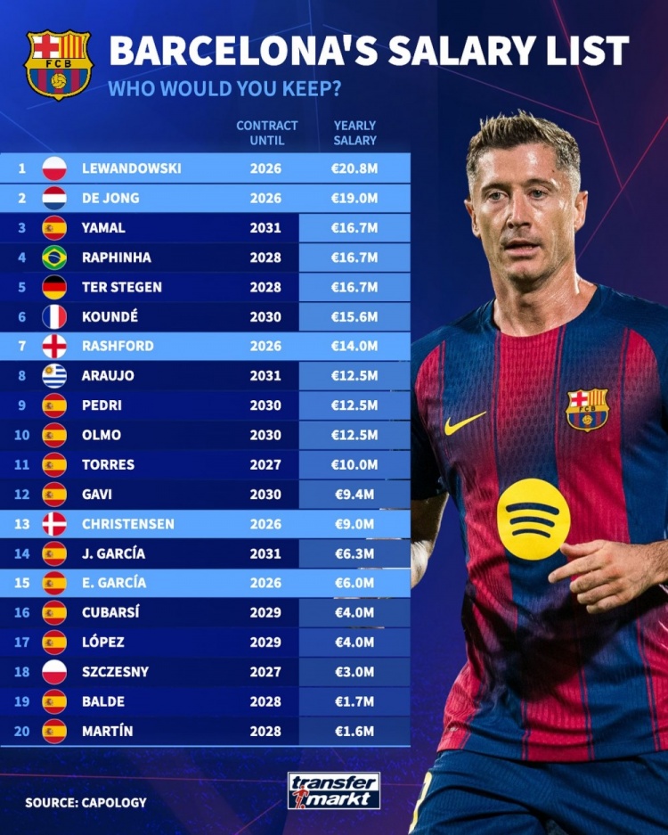 德转列巴萨年薪榜:莱万2080万欧居首,德容1900万欧次席