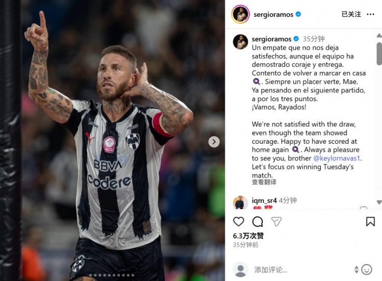 攻破老队友把守球门,拉莫斯社媒:见到我的兄弟纳瓦斯老是很欢笑