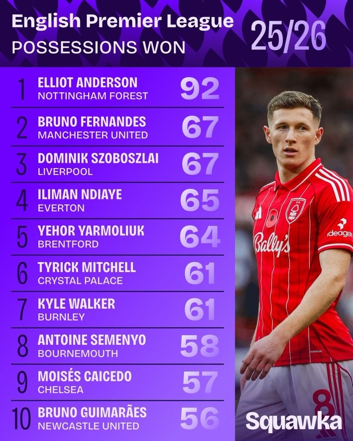 本赛季英超获得球权榜:安德森断崖领跑,B费、索博、凯塞多在列