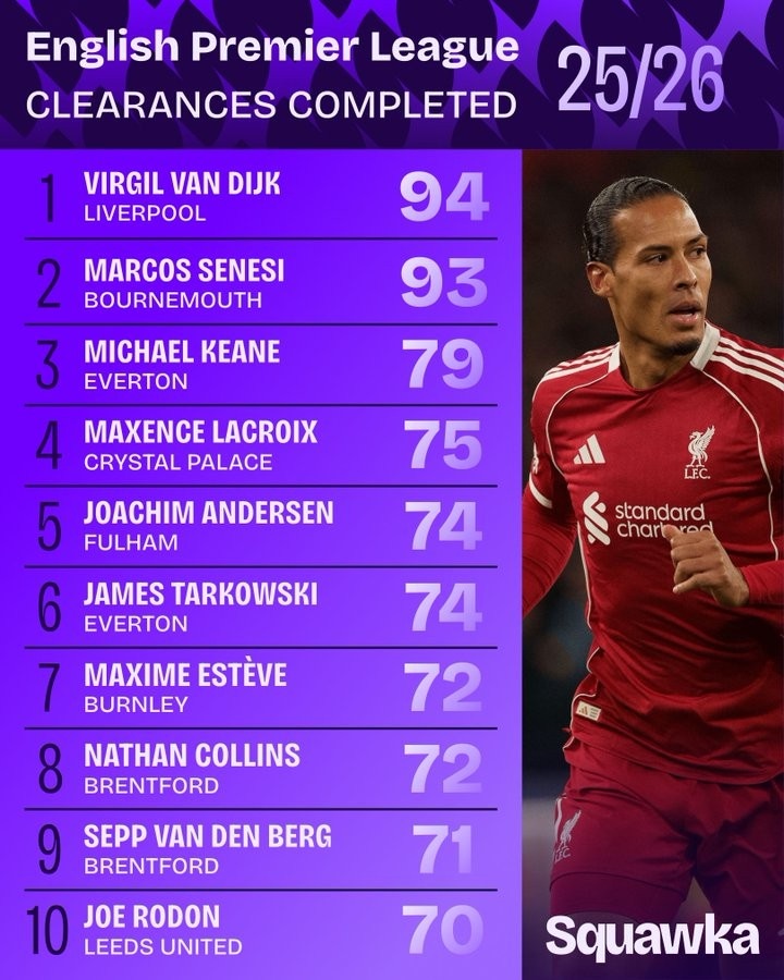 11月11日讯 英超联赛还是进行了11轮,squakwa也统计了本赛季英超突围次数,范戴克力压塞内西居首。