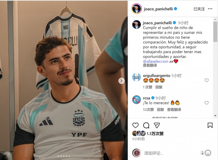 帕尼切利社媒谈阿根廷队首秀:杀青儿时梦念念,将奋力图取更多契机