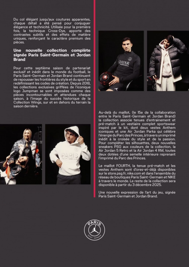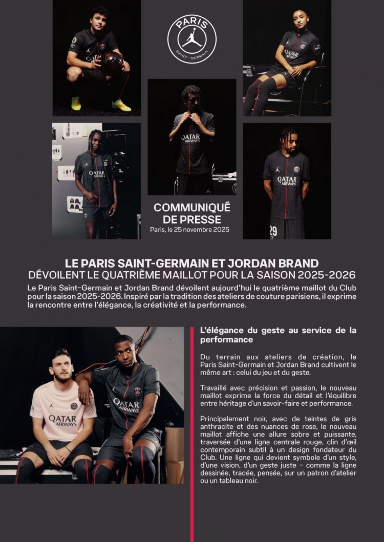 11月25日讯 官方音尘,巴黎与乔丹品牌至本日公布了俱乐部2025-26赛季的第四款球衣。其野心灵感源自巴黎时装工坊的传统,阐扬注解了优雅、创意与性能的和会。