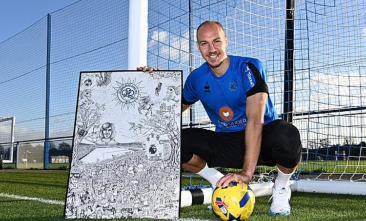 弗雷于2024年1月从安特卫普加盟女王公园巡游者,在启航点几个月里,他用玄色细线笔在一幅大画布上重现了他在新城市看到的征象。“我不祥情它最终会造成什么表情,但我告诉我方,每天花10到20分钟在这上头,统共可能花了简易50个小时。”画中有荷兰公园的树木和松鼠,街头的东说念主们和谢泼德市集,还有洛夫特斯路球场,前球员们的球衣,以及已故的俱乐部别传球员鲍尔斯的形象,他升天时75岁,距离弗雷加盟仅一个月。
