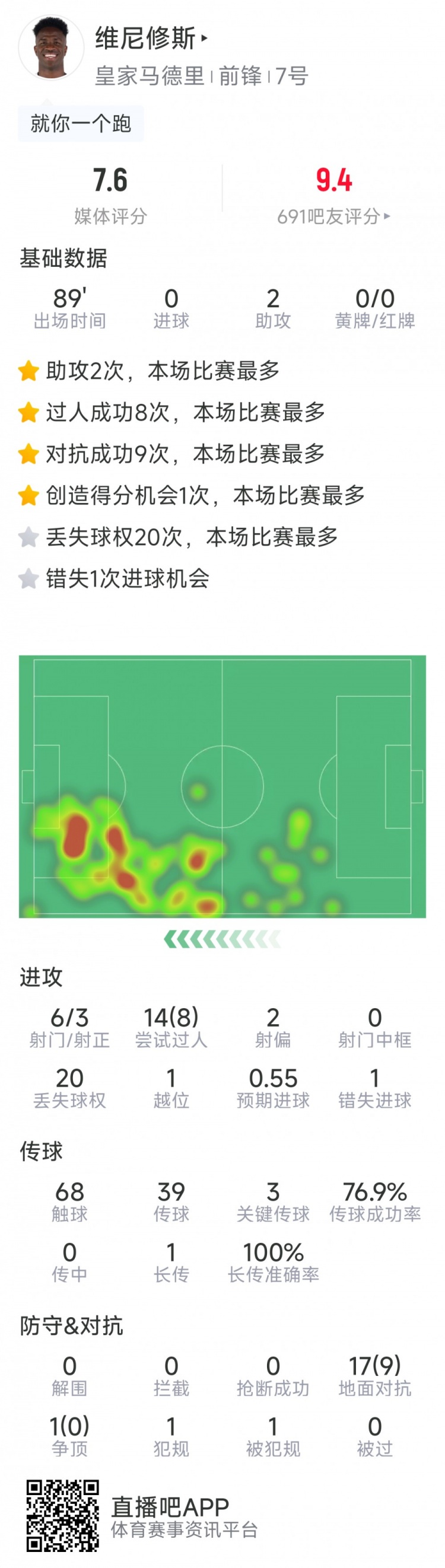 维尼修斯本场数据:2次助攻,6射3正,8次成效过东谈主,3次要道传球