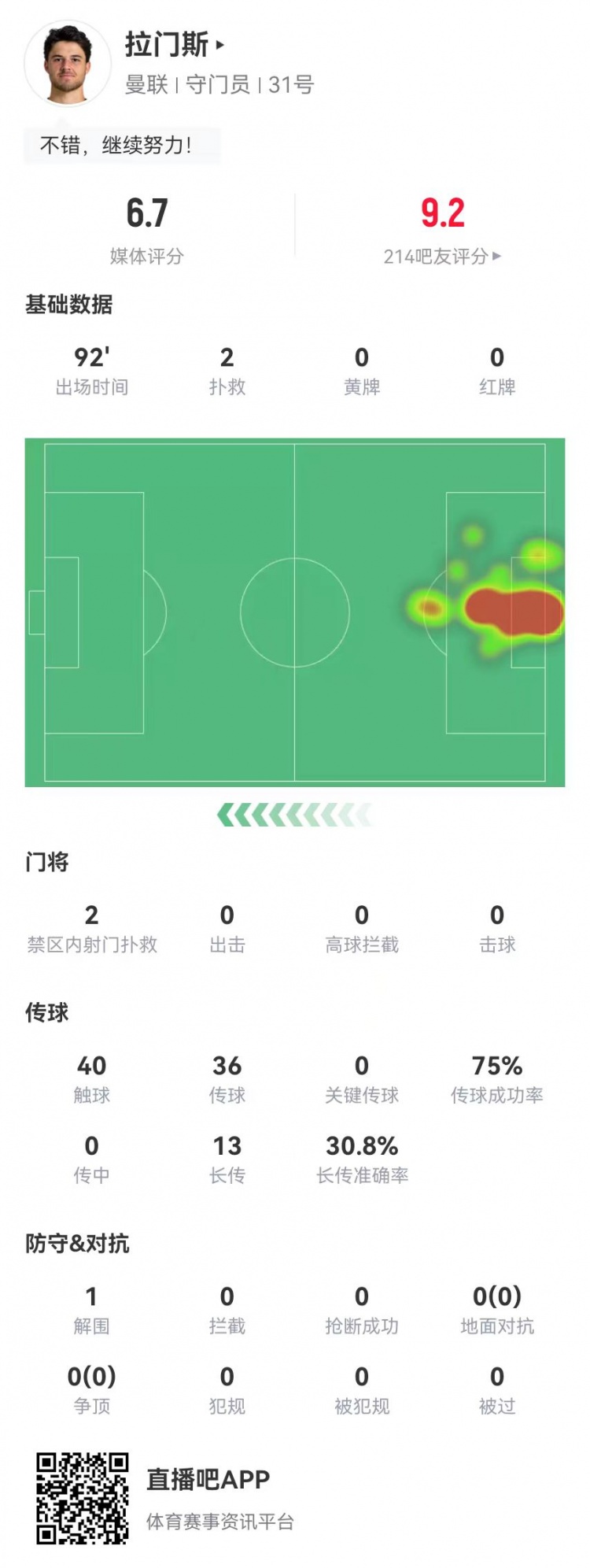 拉门斯本场数据:2扑救+1突围+13长传4到手 获评6.7分