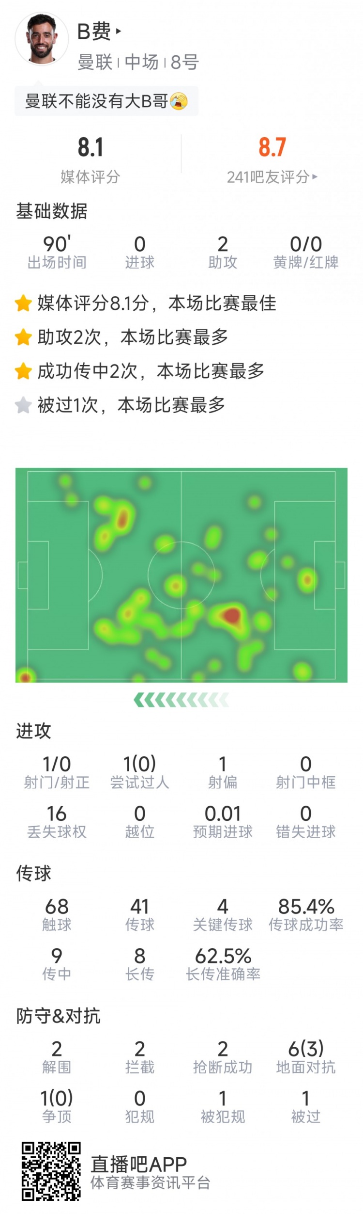 B费本场数据:助攻双响,4次要害传球,1次射门,2抢断、2抑制