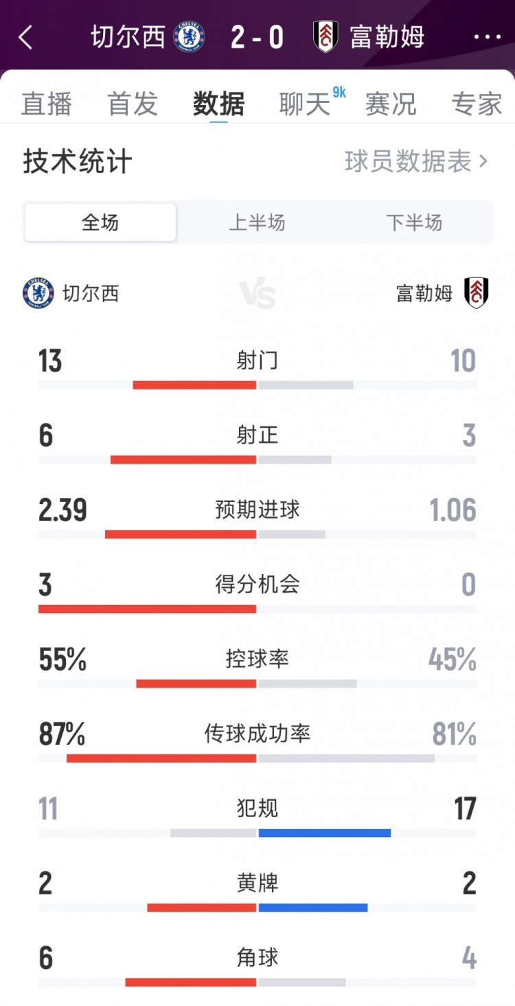 切尔西2-0富勒姆全场数据:射门13-11,射正6-3,得分契机3-0