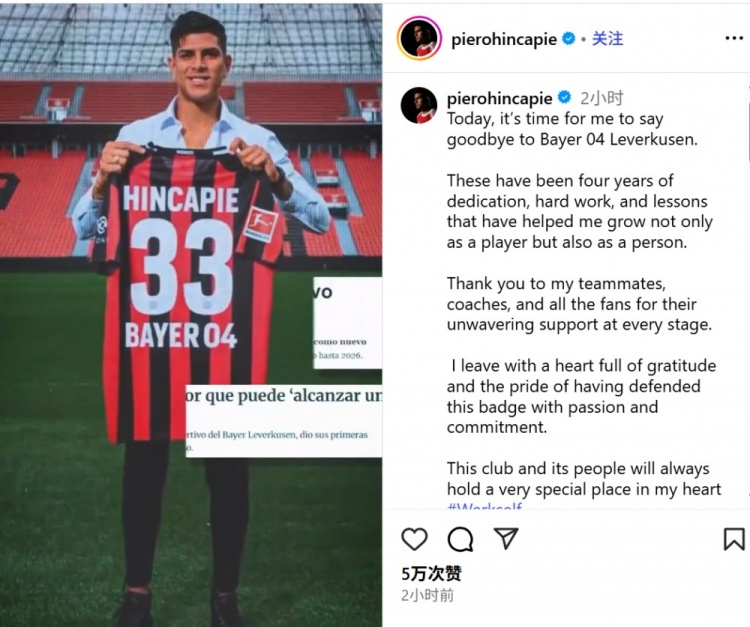 9月2日讯 阿森纳照旧官宣引进勒沃库森中卫因卡皮耶,后者也通过社媒发文向药厂告别: