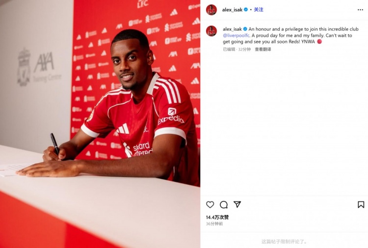 伊萨克示意:“很侥幸大略加入利物浦这个不行想议的俱乐部。对我和我的家东谈主来说,这齐是值得倨傲的一天。迫不足待地想尽快见到你们,赤军们!YNWA(永不独行) 🔴”