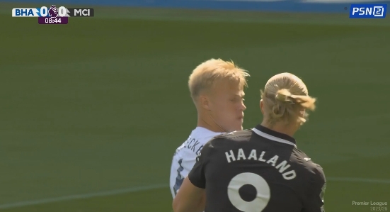 08月31日讯 曼城vs布莱顿第9分钟,哈兰德单刀力量太小被充公!跟防的范赫克推搡哈兰德,随后哈兰德抗击不睦!
