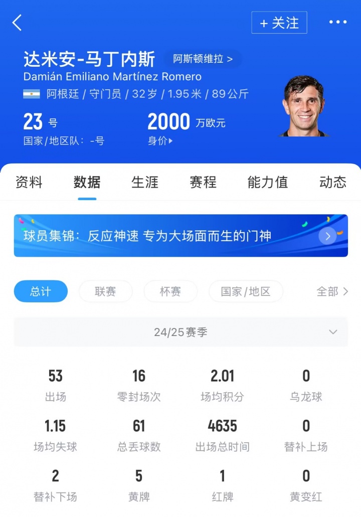 马丁内斯现年32岁,阿根廷门将。现在球员德回身价为2000万欧元。