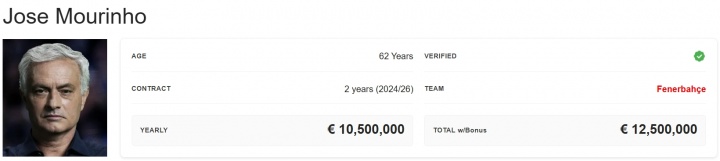 前年6月上任时,费内巴切官方曾清晰穆里尼奥捏教薪水。穆帅那时与费内巴切签约两年,基础年薪1050万欧,奖金200万欧,年薪最高可达1250万欧。提前下课意味着穆帅只拿到了捏教第一年的薪水。