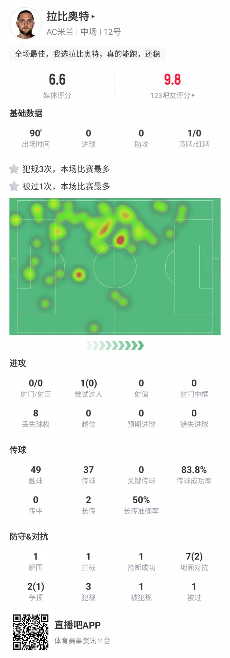 9月29日讯 米兰在本轮意甲2-1打败那不勒斯,首发出场的拉比奥特踢满90分钟,以下是他的个东谈主数据。
