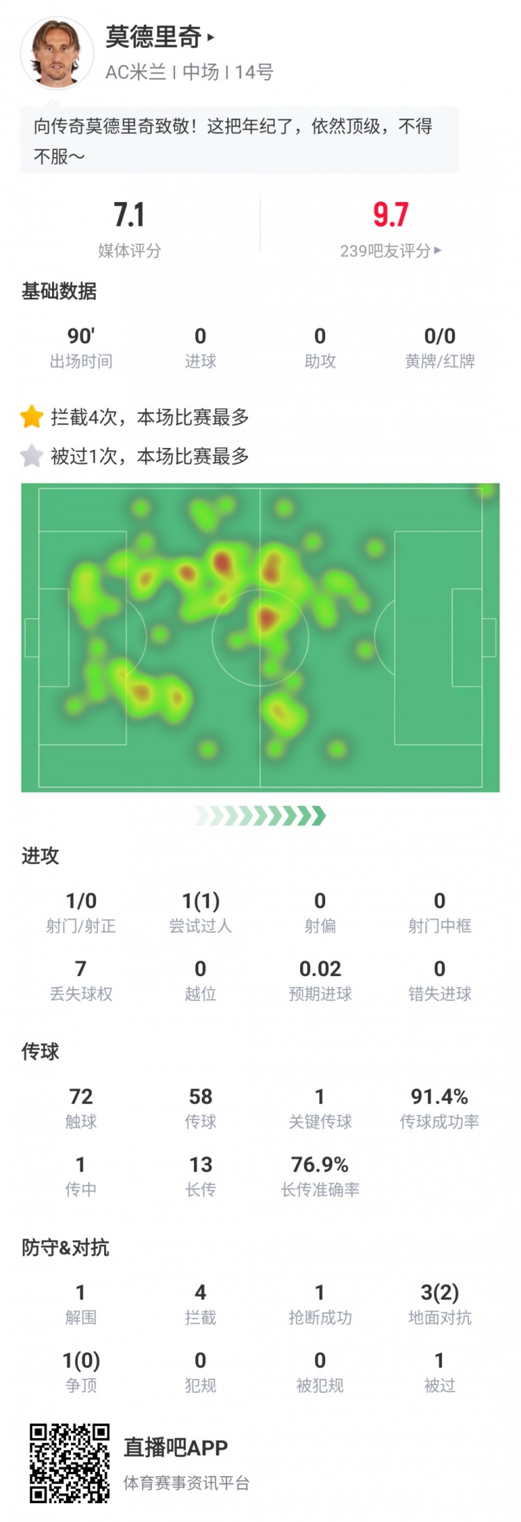 能攻能守!莫德里奇本场数据:传球得手率91.4%,4次防止本场最多