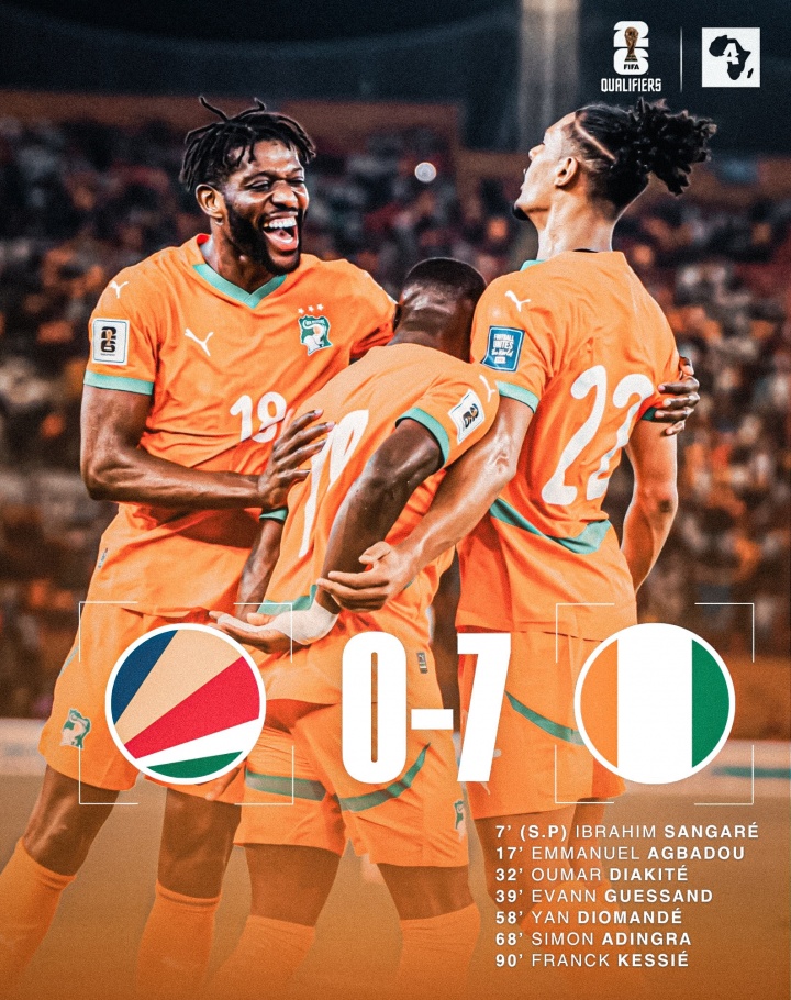 距宇宙杯一步之遥!科特迪瓦7-0塞舌尔,朝上第二1分+11个净胜球