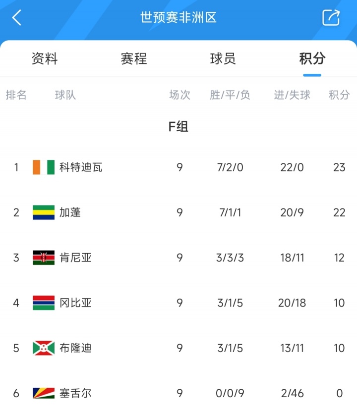 至此,在预选赛还剩1轮的情况下,科特迪瓦朝上第二加蓬1分+11个净胜球,主动权仍抓在手中。此外,除了9个小组第一纵贯宇宙杯,非洲区9个小组中最佳的4个第二将角逐附加赛限额。