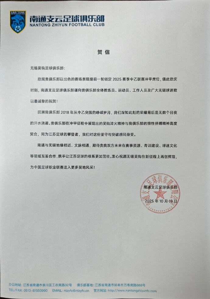 欣闻贵俱乐部以出色的赛场推崇提前一轮锁定2025赛季中乙联赛冲甲席位,值此欢庆时分,南通支云足球俱乐部谨向贵俱乐部整体西宾员、引导员、职责主说念主员及宽阔无锡球迷致以最真诚的道贺!