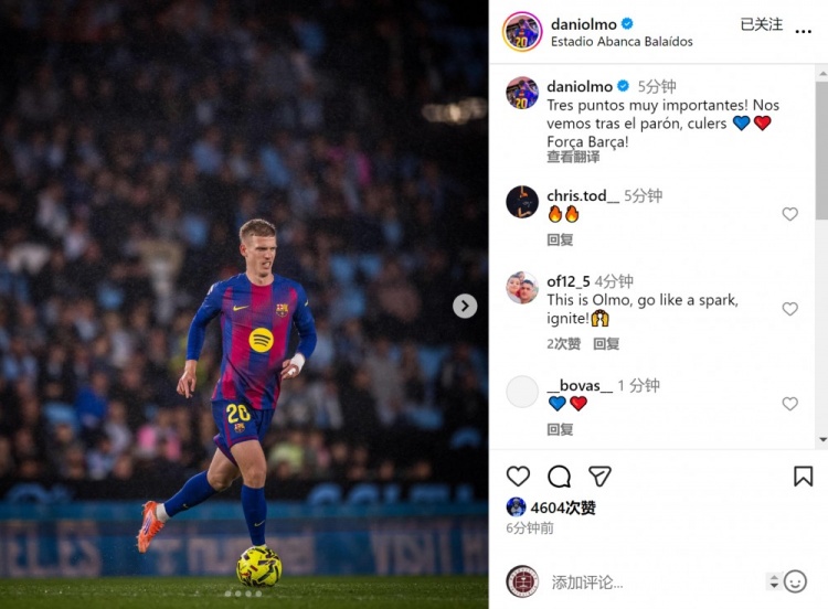 奥尔莫社媒晒出比赛相片,配文:“特地紧迫的三分,巴萨球迷们,我们休赛期之后见,加油巴萨!”