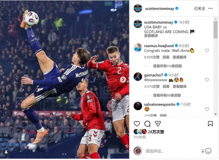 麦克托米奈社媒庆祝球队投入全国杯,配文:“好意思国宝贝,苏格兰来了!”