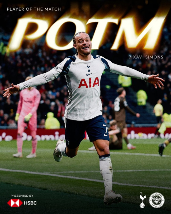 德甲积分榜 热刺活命首球+助攻, 哈维·西蒙斯当选热刺2-0布伦特福德队内最好