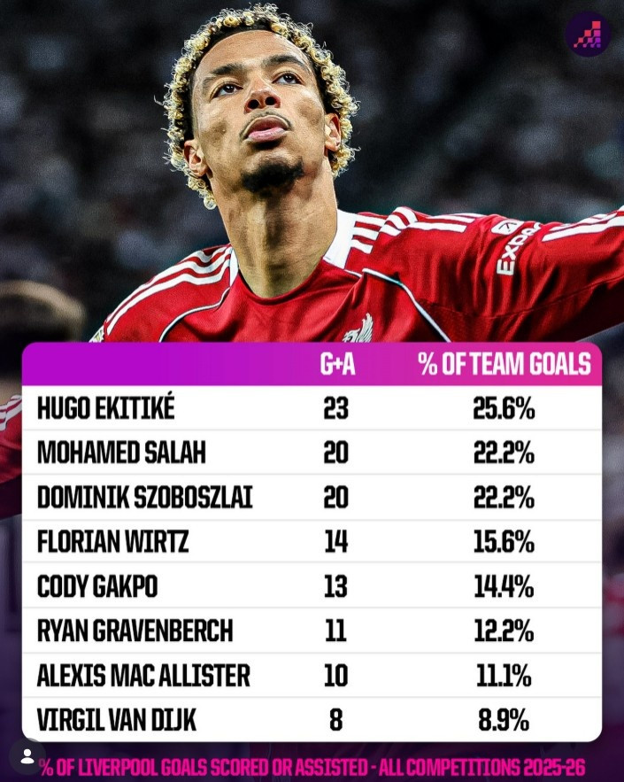 直播吧4月15日讯埃基蒂克疑似跟腱负伤 将长期缺战,这对利物浦攻击力无疑是巨大打击。OPTA盘点了本赛季利物浦队内各项赛事加入 得分 (得分 +助功 )情况,具体如下(加入 得分 +队内占比)