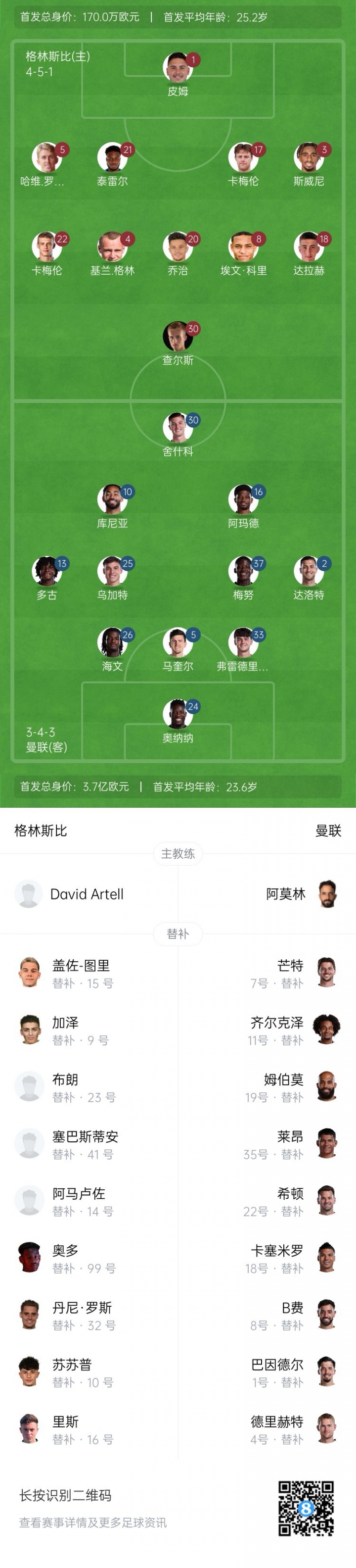 格林斯比首发:1-皮姆、5-哈维-罗杰斯、21-沃伦、17-卡梅伦-麦克詹内特、3-斯威尼、20-乔治-麦凯克兰、22-卡梅伦-加纳、4-基兰-格林、8-埃文-库里、18-达拉赫-伯恩斯、30-查尔斯-维尔南