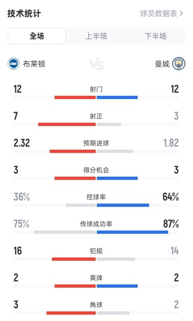布莱顿2-1曼城全场数据:射门12-12,射正7-3,控球率36%-64%