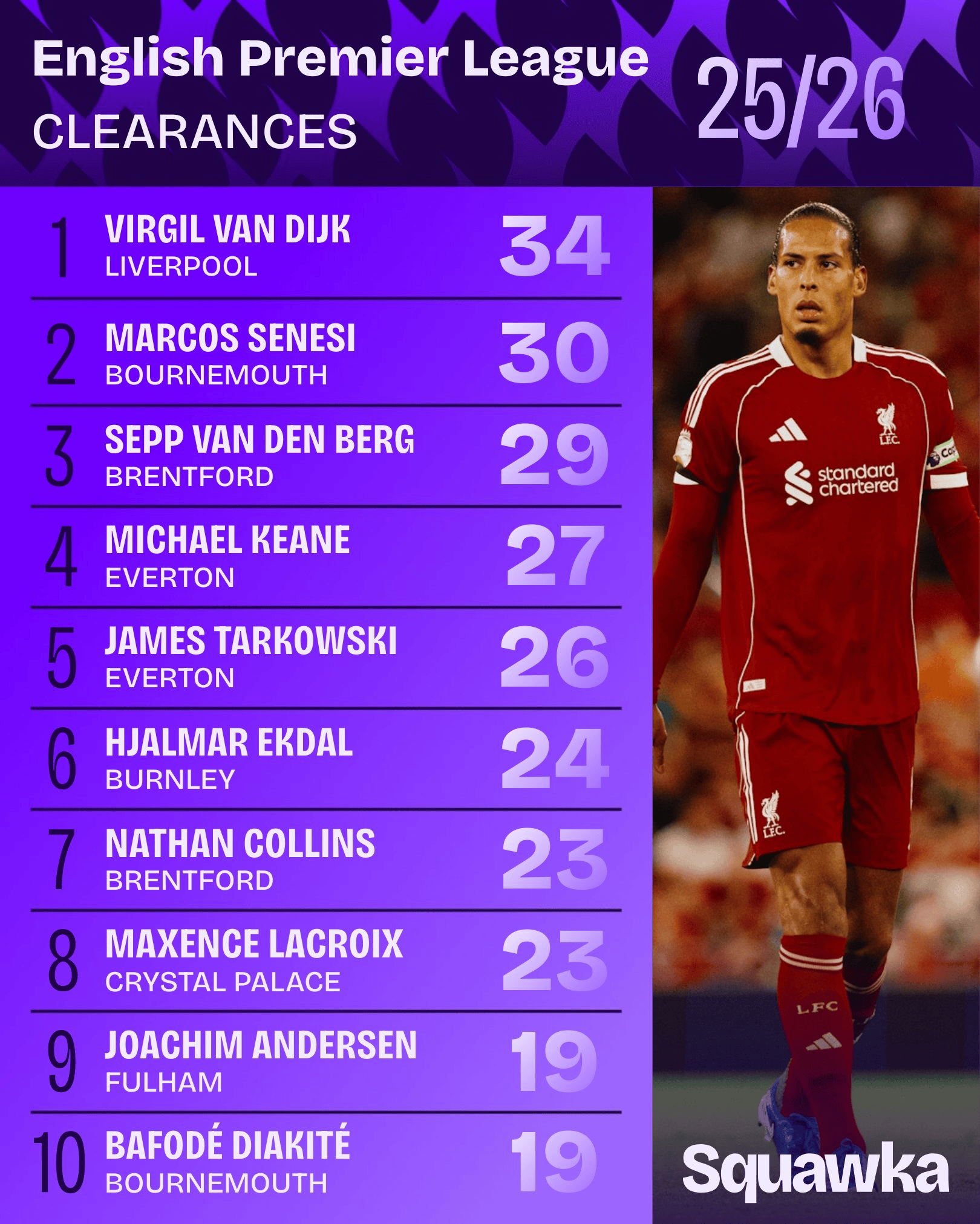 英超突围榜: 范戴克居首, 塞内西、迈克尔-基恩在列