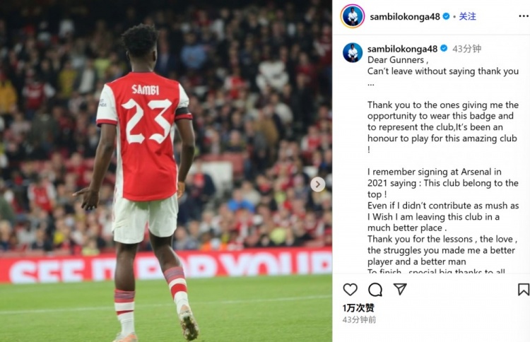 洛孔加社媒告别:未能称愿作念出更多孝敬,为阿森纳遵循是我的庆幸